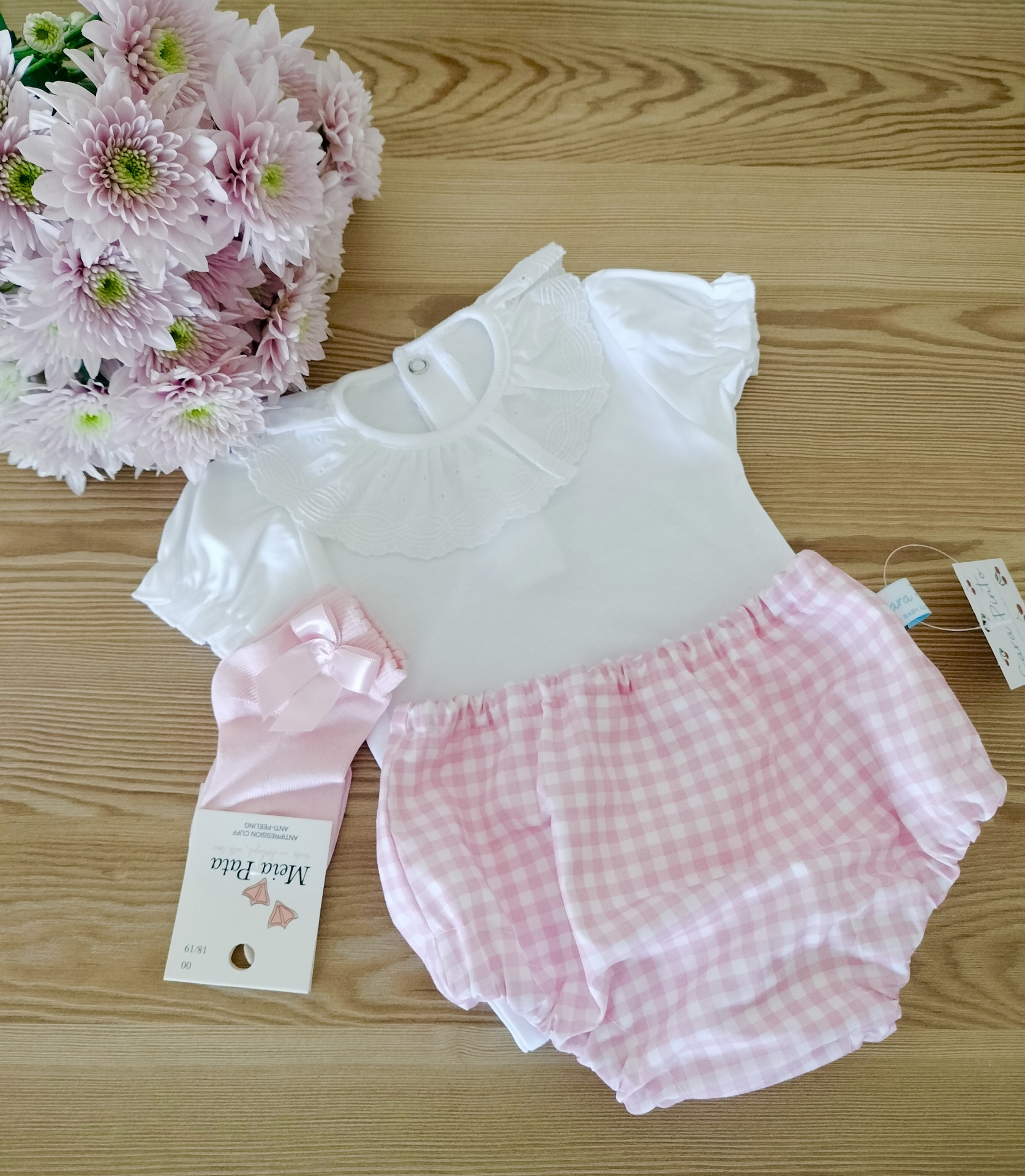 • Conjunto de bebé branco e rosa com flores cor-de-rosa sobre mesa de madeira
