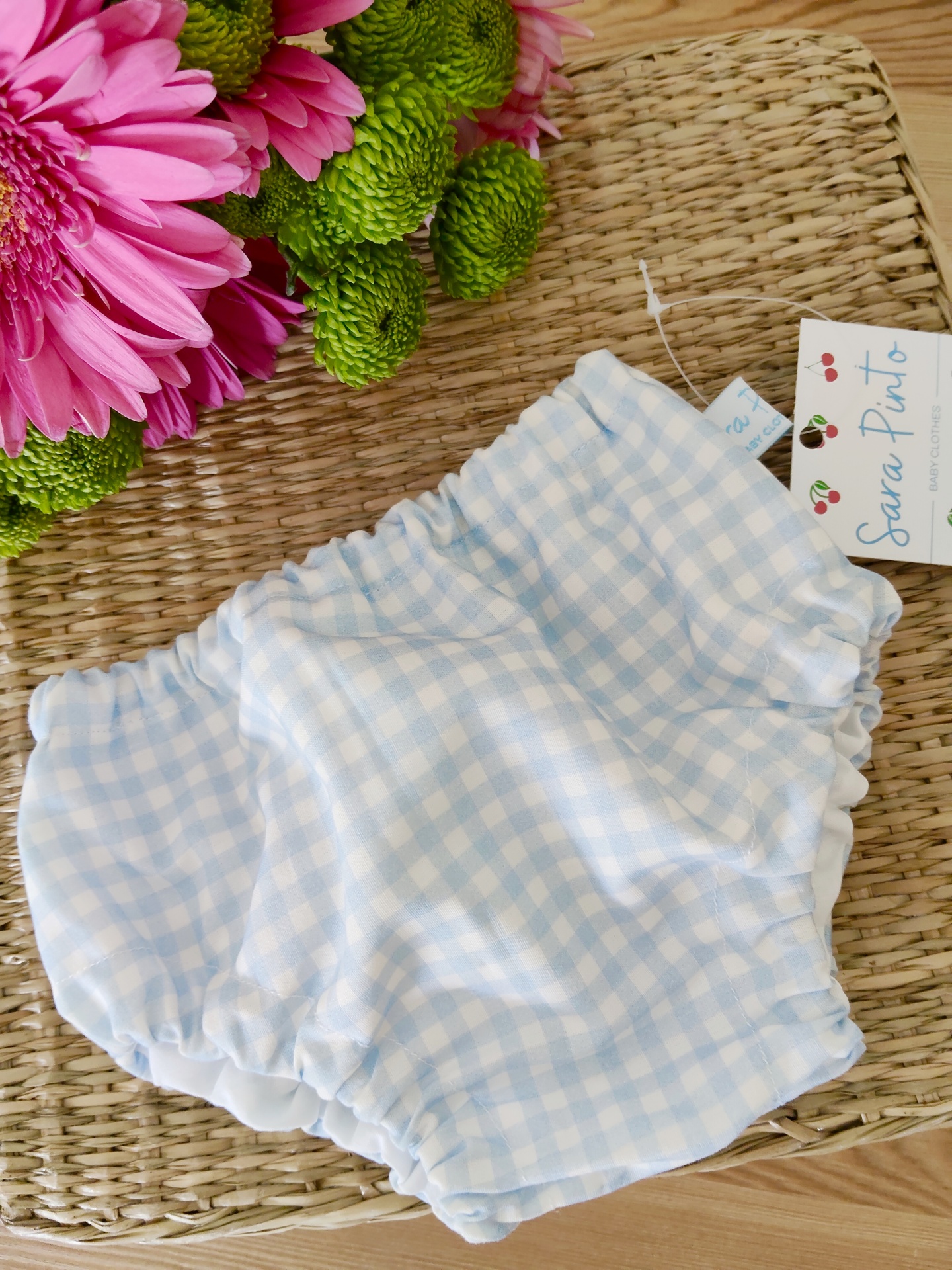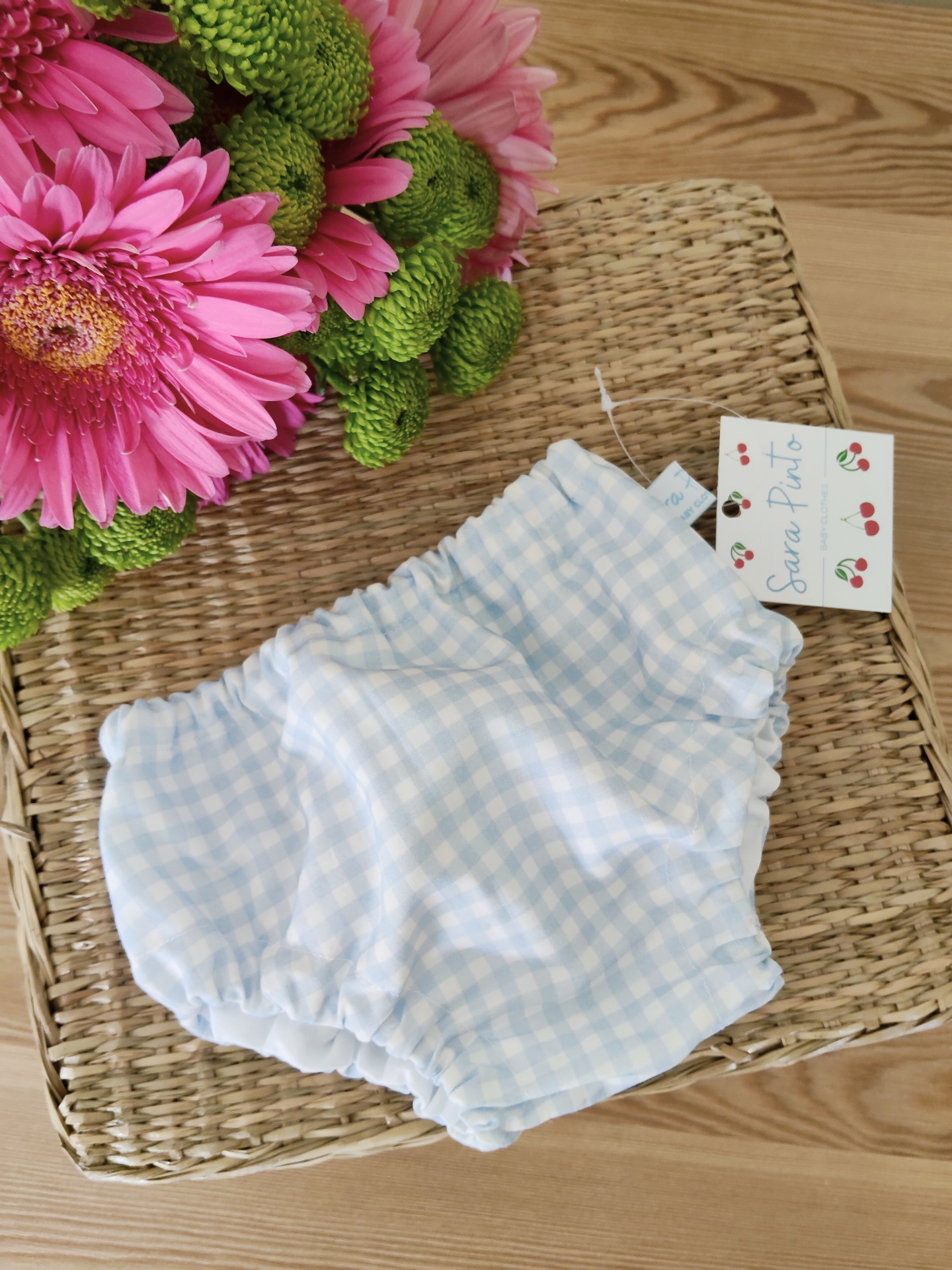 • Calções de bebé azul claro com padrão xadrez em tecido algodão sobre rattan e flores.