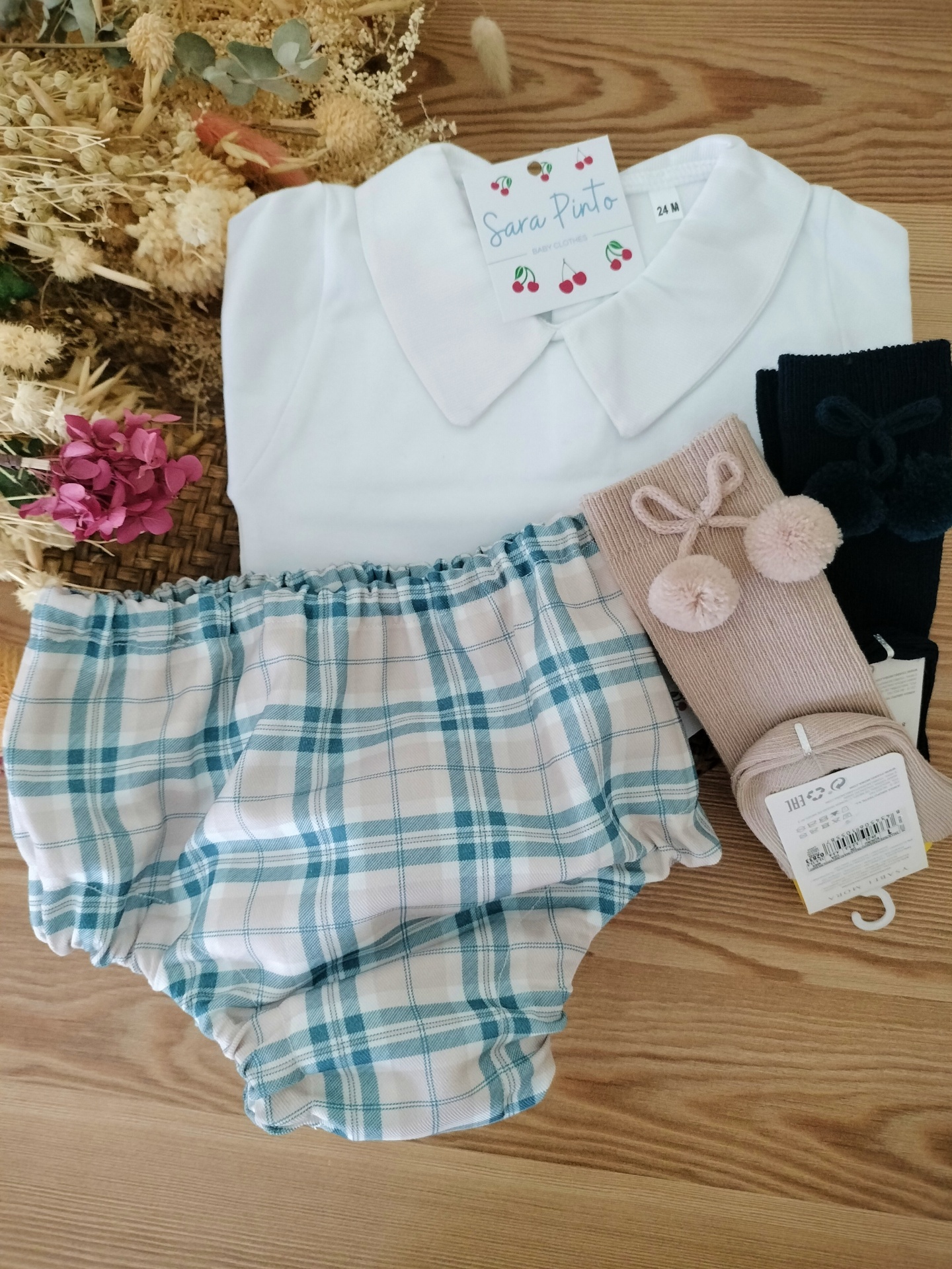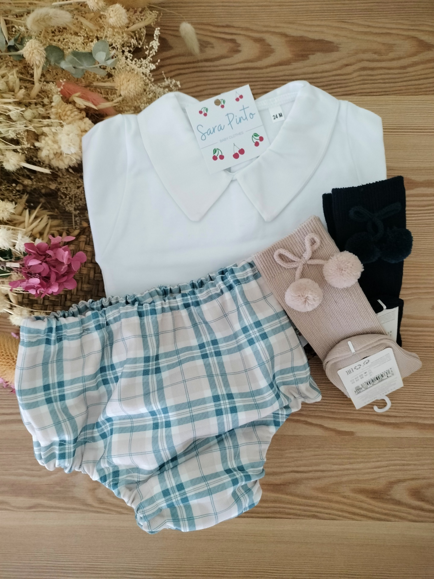 • Conjunto de roupa infantil com camisa branca, calção aos quadrados azul e branco, e duas meias coloridas em superfície de madeira com flores secas.