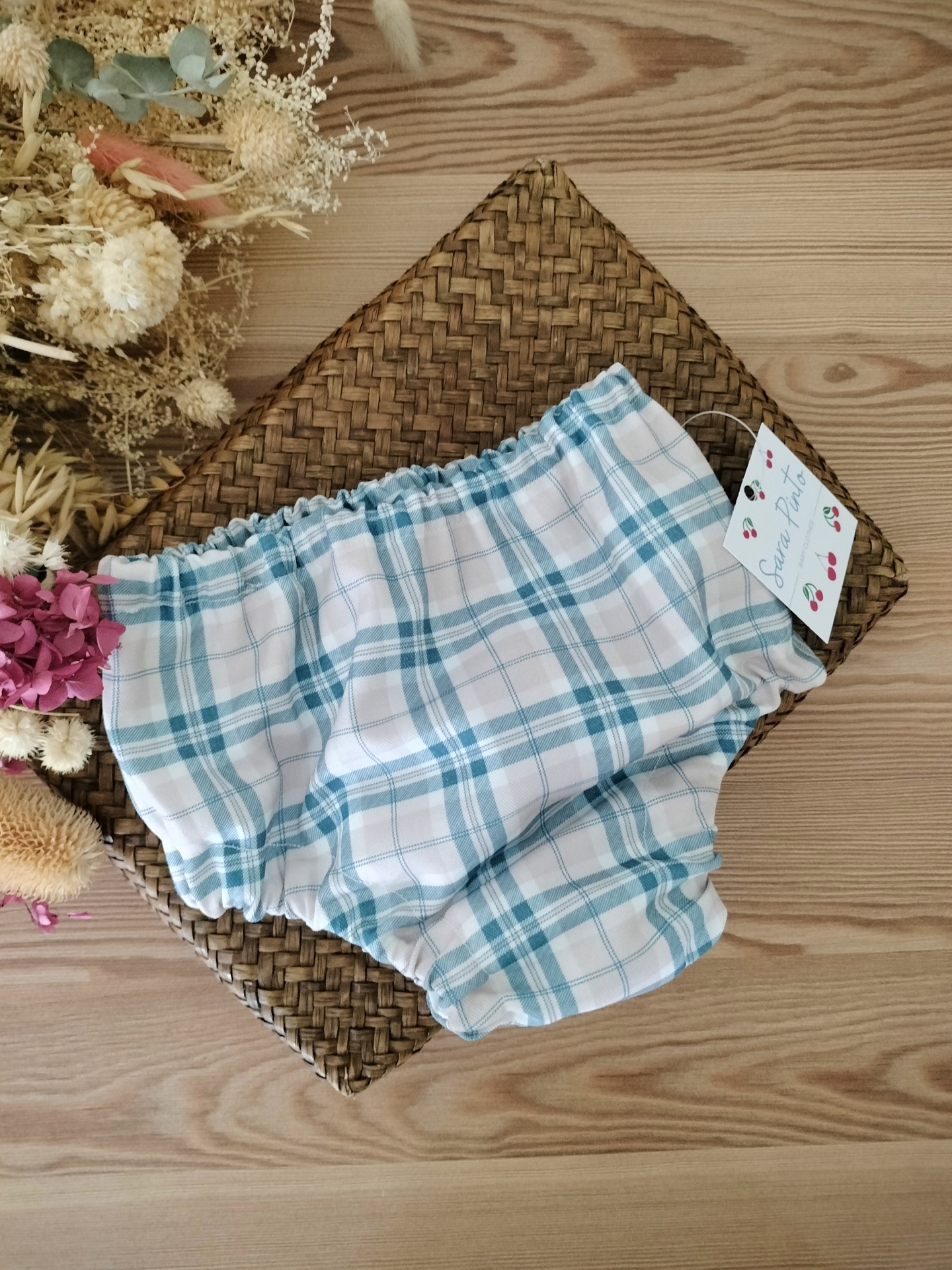 • Cueca xadrez azul e branco com elástico, sobre esteira de fibra, com flores secas ao lado