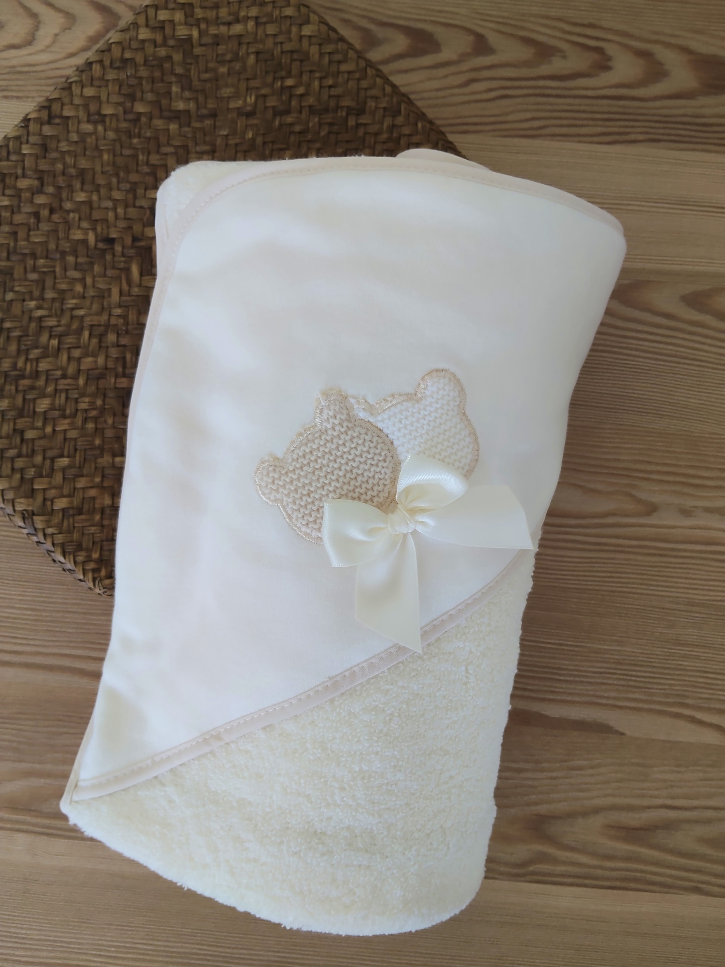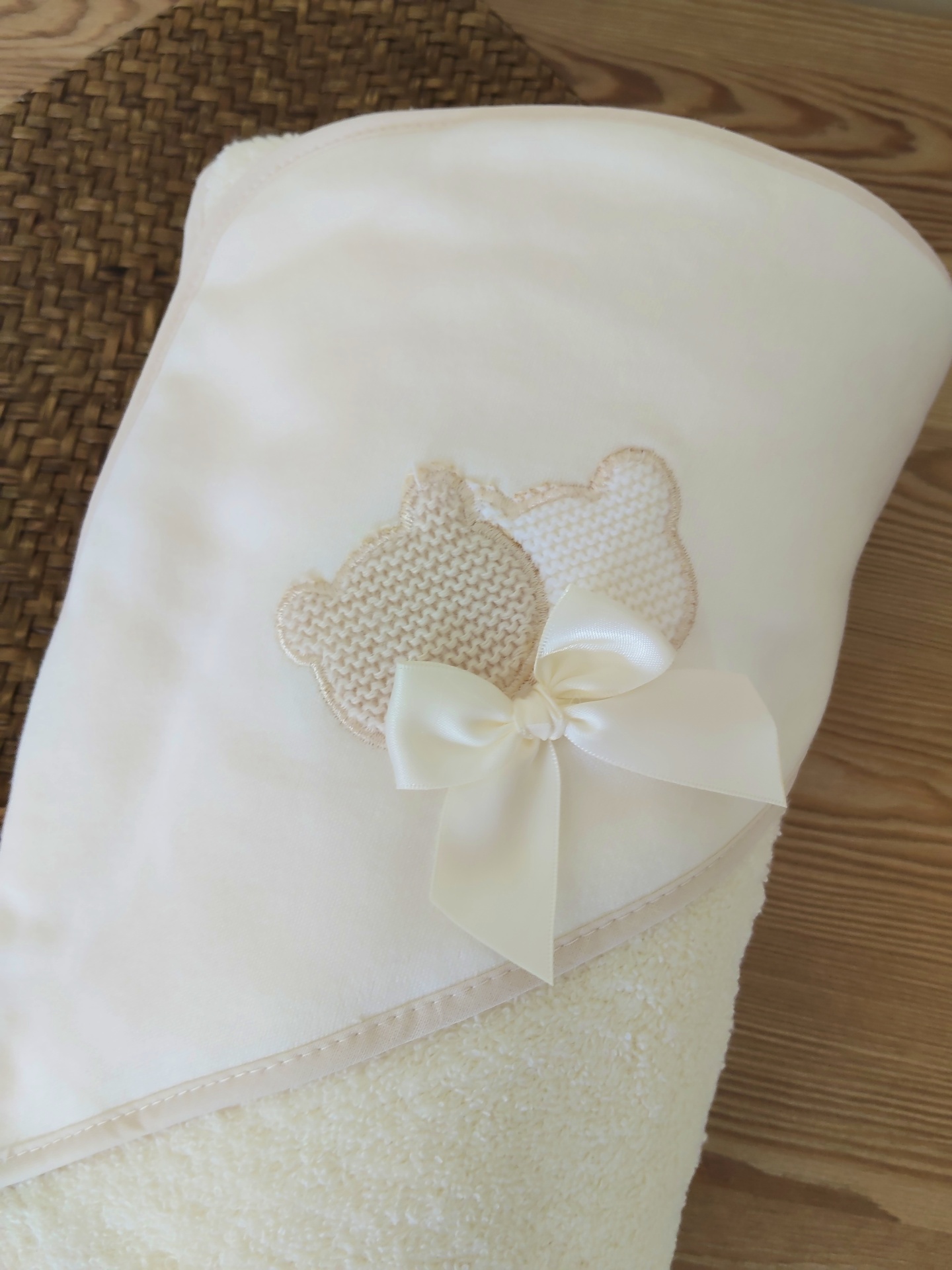 • Toalha de banho branca para bebé com ursinhos em tecido e laço de cetim, sobre madeira clara.