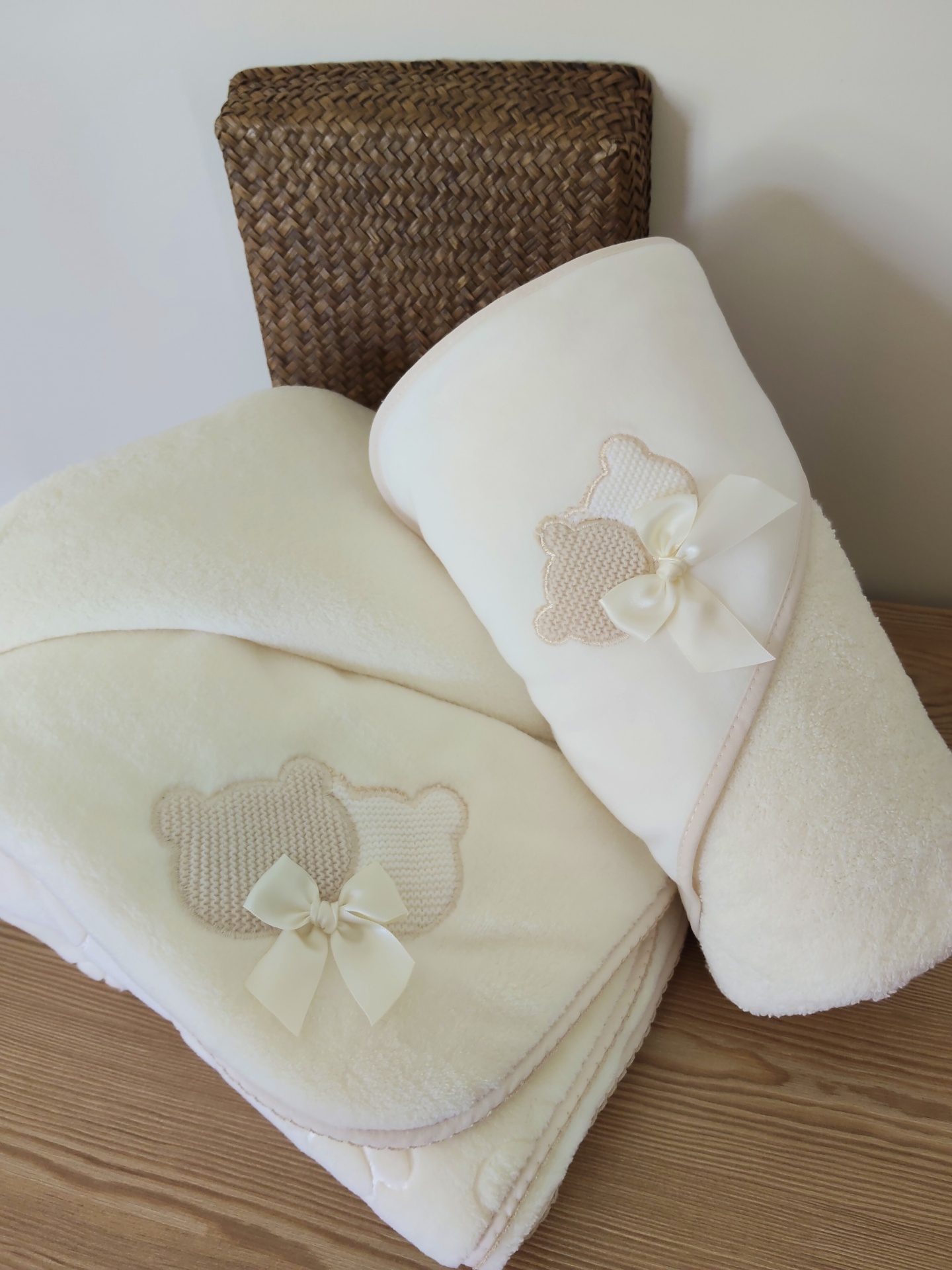 • Toalha de banho branca para bebé com ursinhos bordados e laços, sobre mesa de madeira com cesta trançada